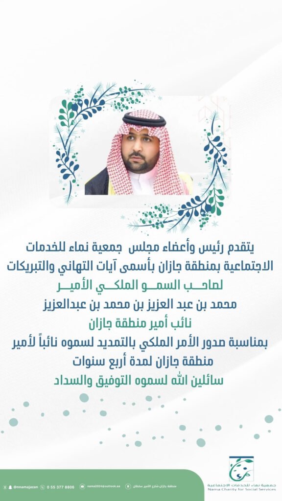 جمعية نماء للخدمات الإجتماعية .. تهنئ صاحب السمو الملكي الأمير محمد بن عبدالعزيز بن محمد بن عبدالعزيز آل سعود بتمديد ولايته نائباً لأمير منطقة جازان لمدة أربع سنوات ، متمنين له التوفيق.