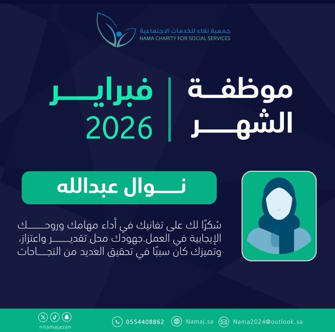 في إطار حرصها على تعزيز ثقافة التقدير والتحفيز الوظيفي، كرّمت جمعية نماء للخدمات الاجتماعية الأستاذة نوال عبدالله، بمناسبة اختيارها «موظفة الشهر»، تقديرًا لجهودها المتميزة وأدائها اللافت في بيئة العمل. ويأتي هذا التكريم تقديرًا لما قدمته من عطاء مستمر، والتزام مهني…